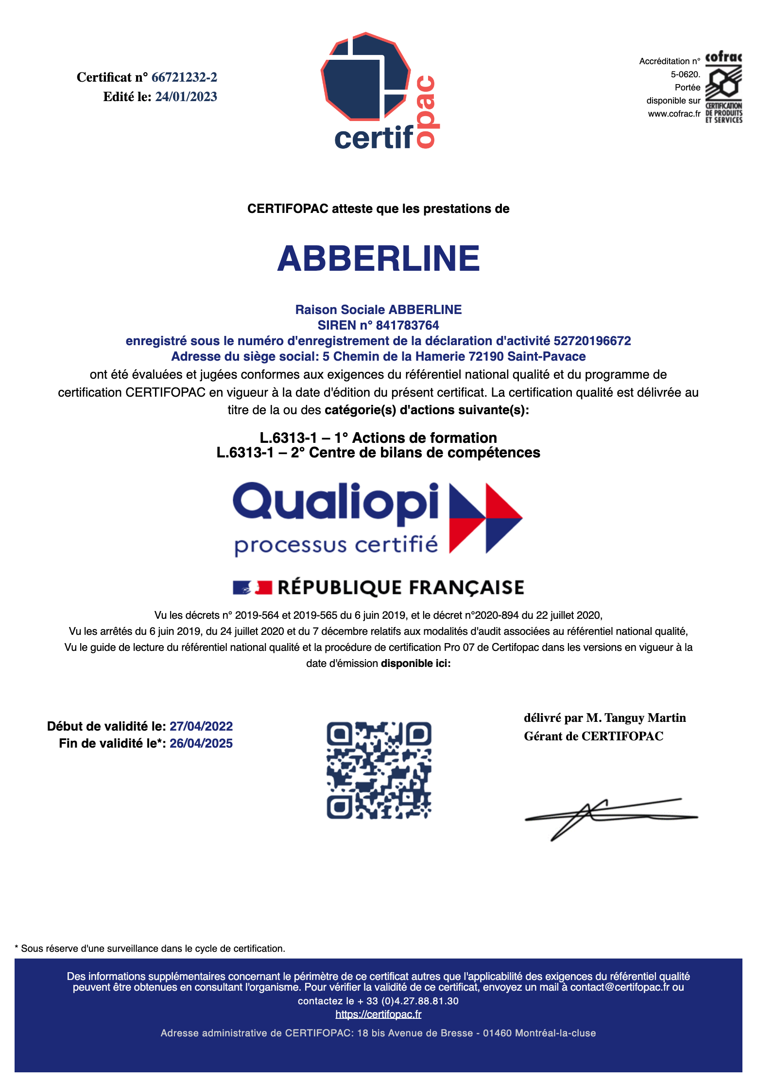 Nos formations vous donnent accès à la certification Abboard. Premièrement, c'est super classe ! Deuxièmement, cette certification permet à vos collaboratrices et collaborateurs d'attester des compétences professionnelles acquises pendant la formation. Bonus, cette certification est convertible en NFT.
